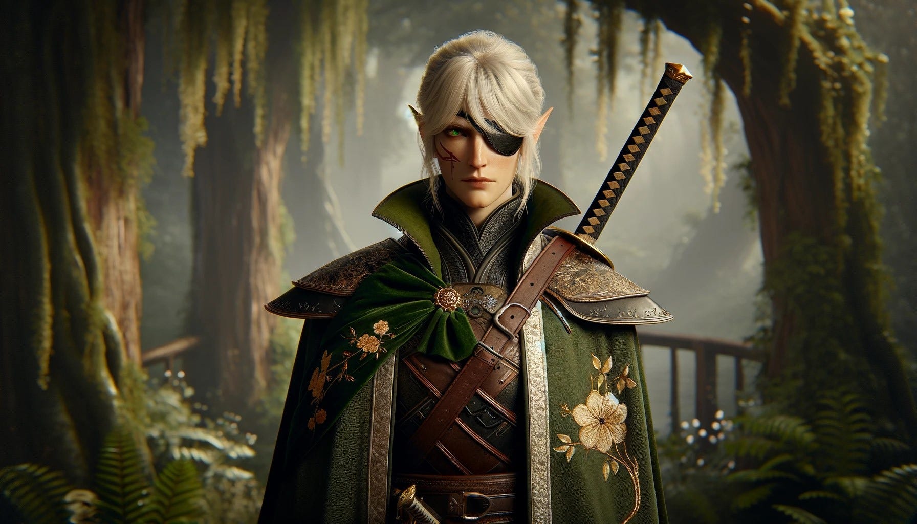 Sidrith lost an eye to a ghoul as she fought the lapis Nomine’s army. She received an eyepatch from her sister, hand-made with silk of her family’s farm. Since her departure from Oriaka, Sidrith hadn’t left without souvenirs: she always wears a fine green silk cloak with the silver-embroidered family symbol on it, and a nacre brooch in her hair, totally getting off with the Shinaï black clothes she wears. Sidrith admitted that the brooch was once owned by Azaïa, a birthday gift Sidrith had bought. Azaïa gave it back when she moved to the imperial quarters, inside the capital, after her marriage. She was slim when she was a fugitive... living on an all-meat orc diet took its toll on her figure. That's why she became a bounty hunter. To make the most of her elven inability to digest fat.
